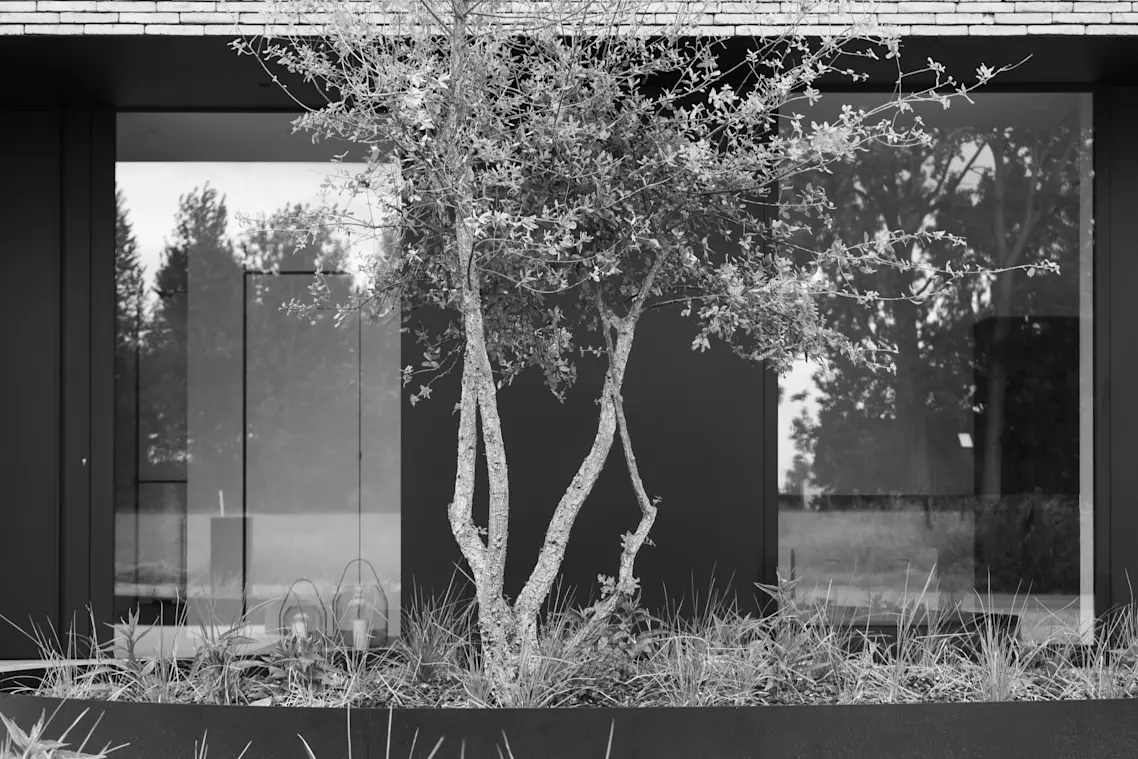 Huis CL weerspiegelt de hedendaagse stijl door een strakke aluminium gevel en luifel in combinatie met een prefab gekaleide gevelsteen. Het overdekte terras met grote overspanning heeft zowel een functionele als esthetische functie. Verzonken ramen met glas-op-glasafwerking en een schuifraam met binnenhoek zorgen voor veel lichtinval. Het maatinterieur trekt de strakke lijn van het exterieur binnen door, maar straalt toch warmte uit door de combinatie van de gekozen materialen: parkettegel, kasten in FENIX, mortex, stalen glasdeur, gashaard, enz.
